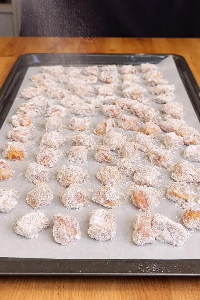Next, add the potato starch to a bowl and coat the chicken pieces evenly. Don’t worry if not all the starch sticks.