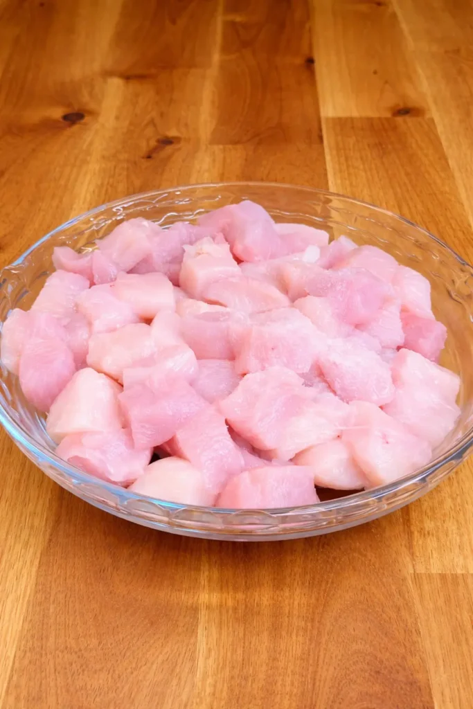 Start by marinating your diced chicken breast in soy sauce, pepper, garlic, and ginger. Give it a good mix so every piece is coated and flavorful.