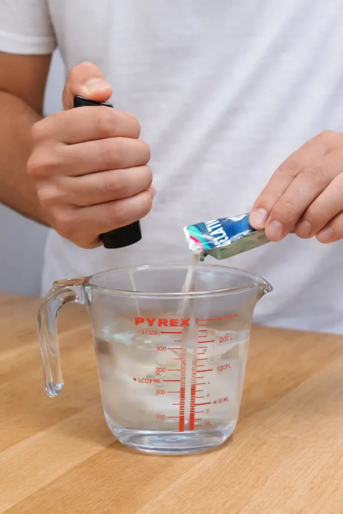 Pour the boiling water into a bowl and immediately whisk in the powdered gelatin. Stir continuously until fully dissolved. There should be no visible granules.