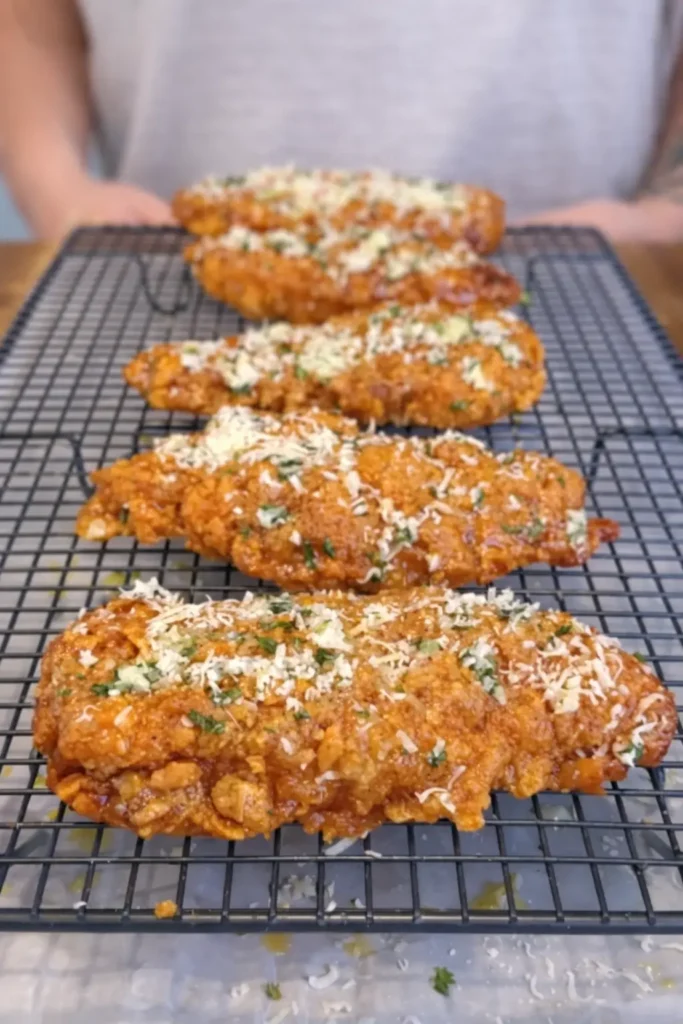Finish the Tenders Once chicken is deeply golden and crisp, brush evenly with garlic butter and immediately sprinkle with freshly grated parmesan.
