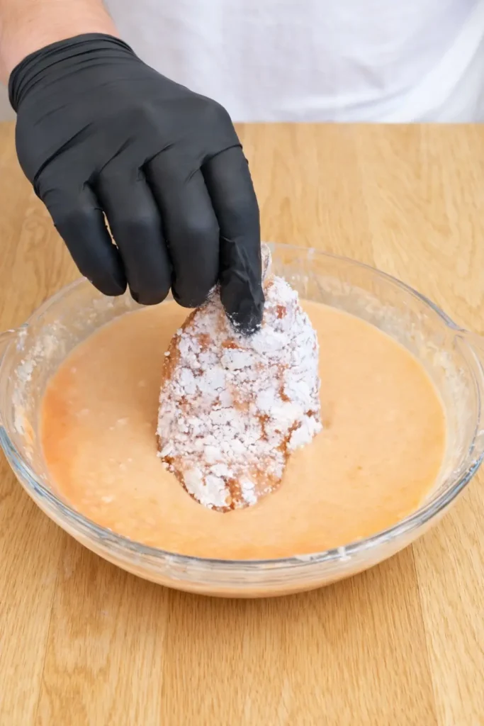 Coat the Chicken Dip each chicken strip into dry flour, then into the wet batter, and finally press back into the crumbly flour mixture. Press firmly so coating adheres well.