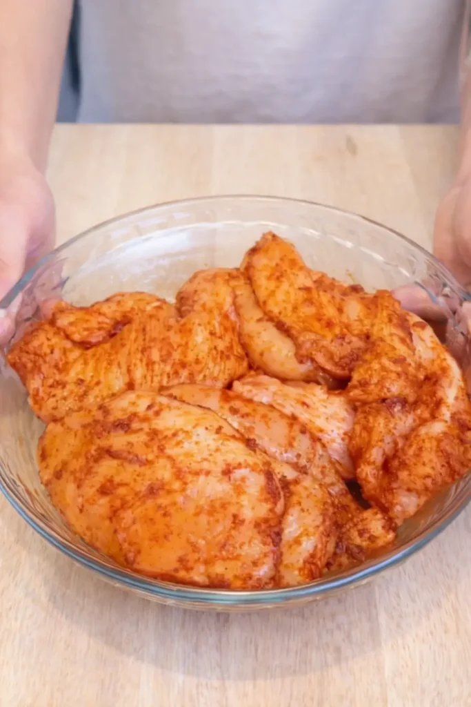 Prep the Chicken Slice chicken breasts into 8 even strips. Toss with salt, smoked paprika, onion powder, and garlic powder. Set aside.