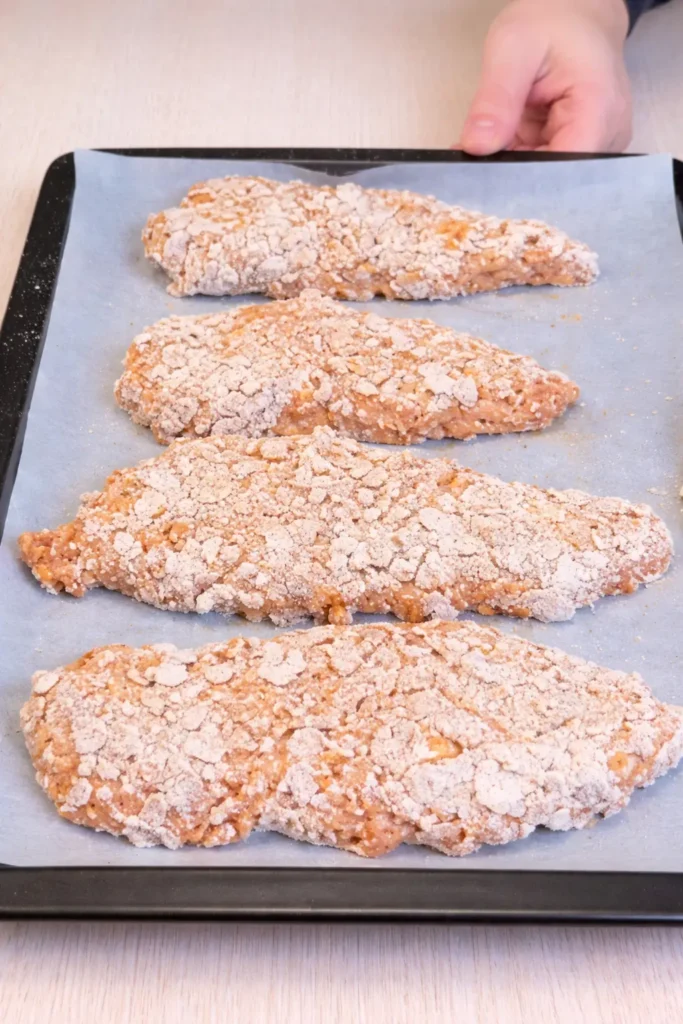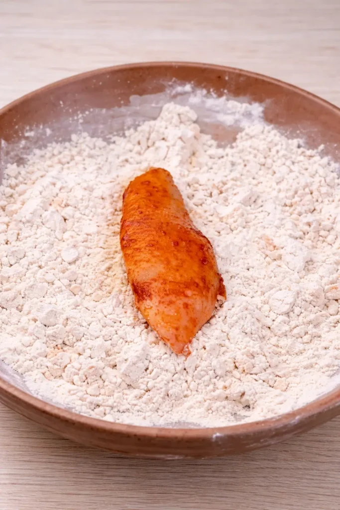 Now comes the magic. Coat each chicken strip in flour, dip it into the wet batter, then press it firmly back into the flour. Don’t skip pressing. That’s what creates that crispy coating.
