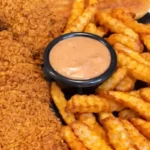 - Serve chicken, fries, and sauce together.