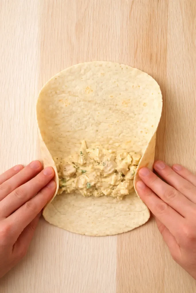 - Add the chicken filling to each tortilla and roll tightly.