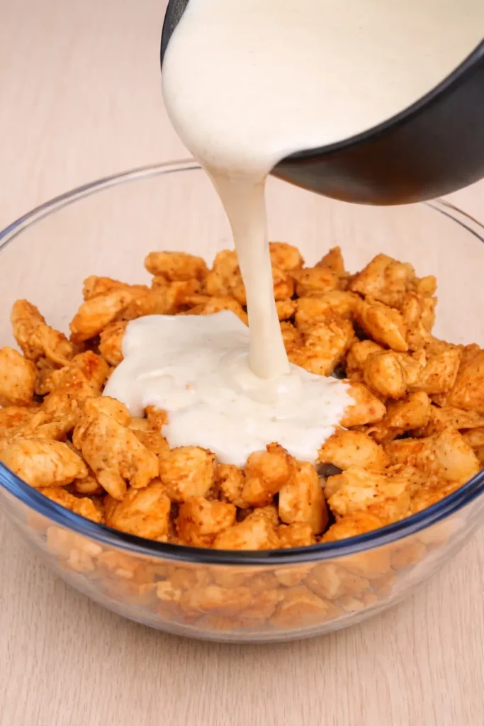Start by dicing your chicken breast into small cubes. Place the chicken in a bowl and add the garlic powder, onion powder, smoked paprika, cayenne, salt, and black pepper. Mix everything together until the chicken is evenly coated with the seasoning.