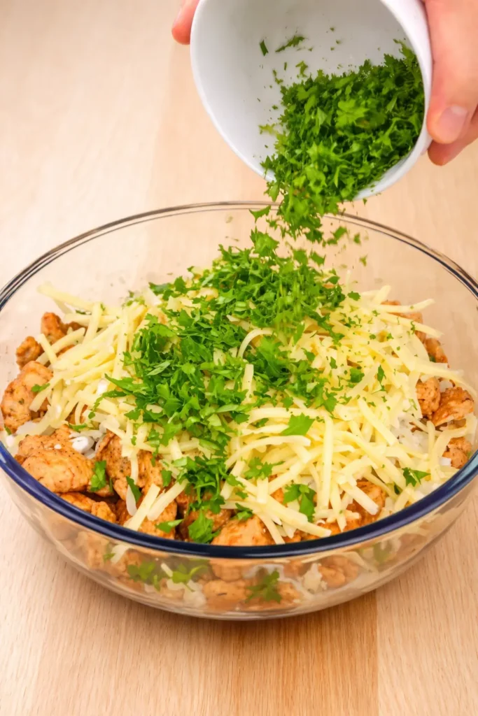 Transfer the cooked chicken to a large bowl. Pour in the garlic sauce, then add the mozzarella, cheddar, and chopped parsley. Stir everything together until the filling is well combined and creamy.