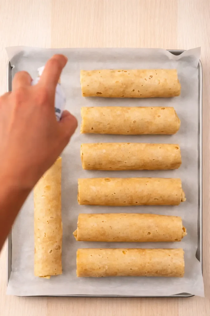 Place the rolls on a baking tray, lightly spray the tops with cooking spray, and bake or air fry until the tortillas become golden and crispy.
