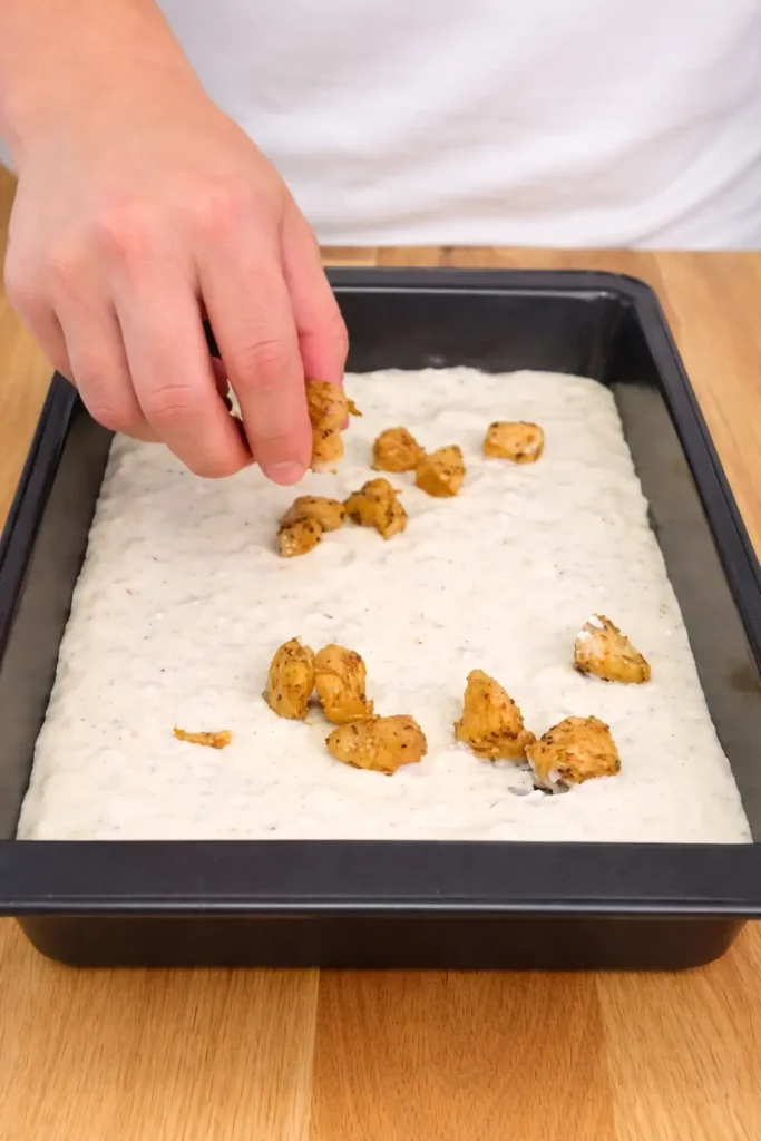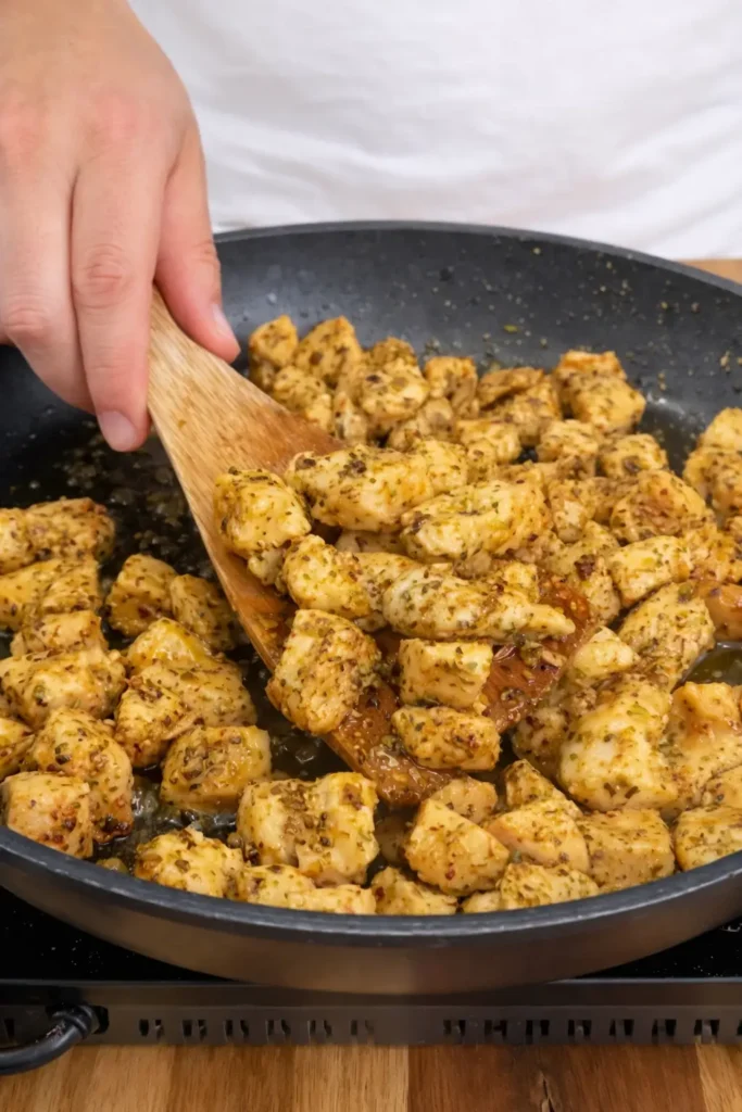 Start by seasoning your diced chicken breast with salt, garlic powder, onion powder, and Italian herbs. Mix well so every piece is coated. Set it aside while you prepare the sauce.