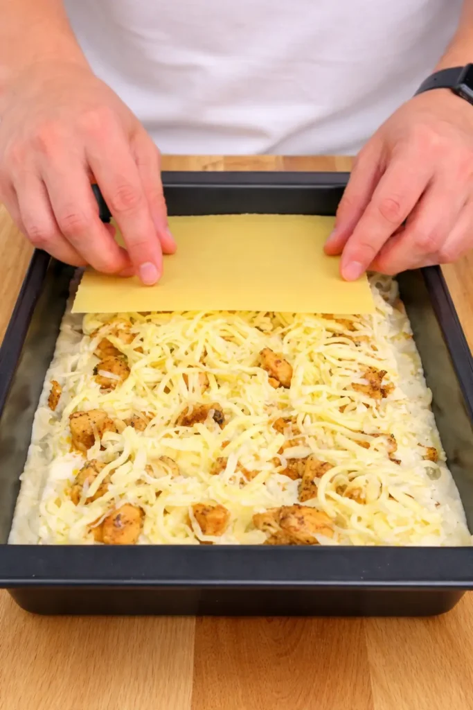- Layer sauce, chicken, lasagna sheets, and cheese in a baking dish.