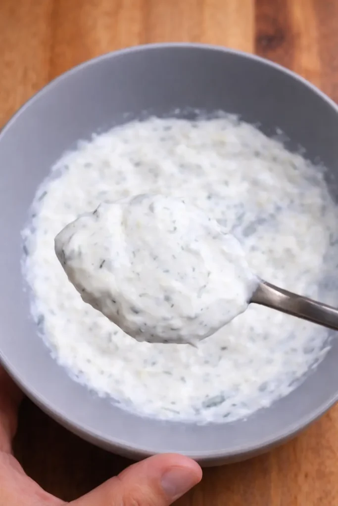 Next, make the tzatziki sauce. In another bowl, mix together the Greek yogurt, grated cucumber, garlic, dill, lemon juice, and salt. Stir until creamy and set it aside in the fridge.