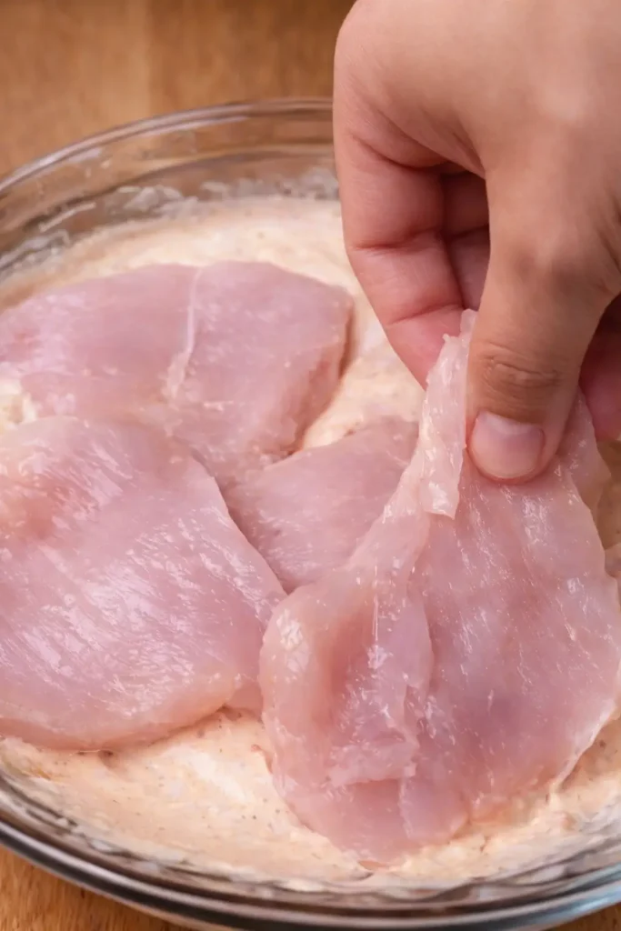 Add the thinly sliced chicken breast and coat it well. Let it sit while you prepare the other components so the flavors soak in.