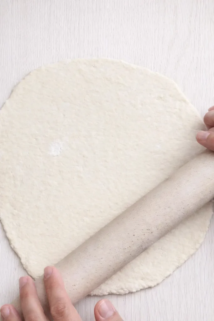 - Combine flour and yogurt to form a dough. Knead lightly and roll into a flat circle.