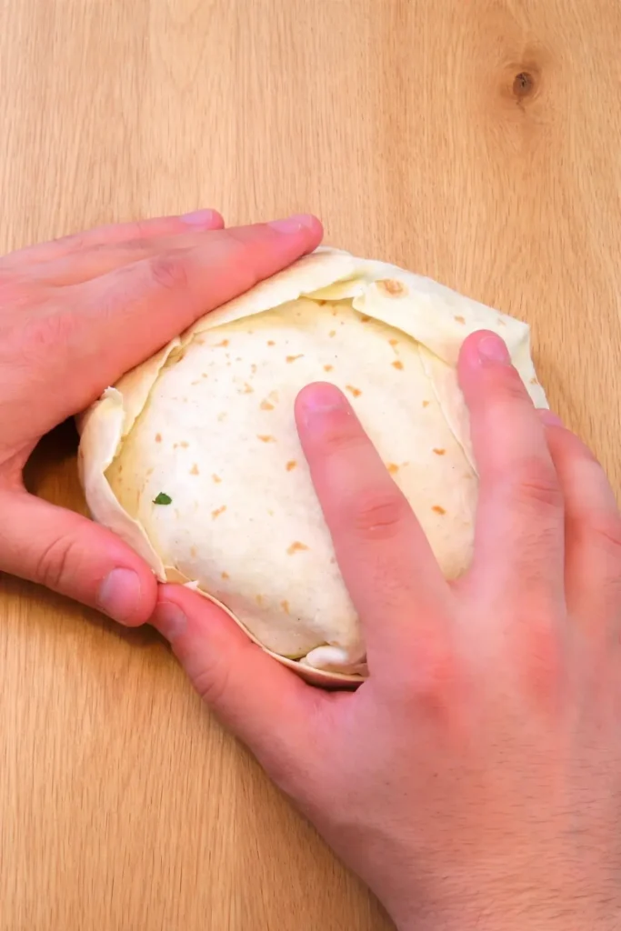 - Fold the edges of the large tortilla toward the center to form a crunchwrap.