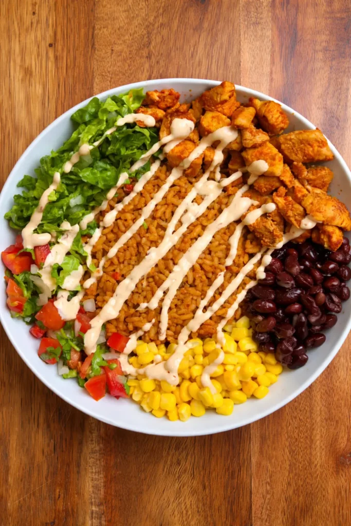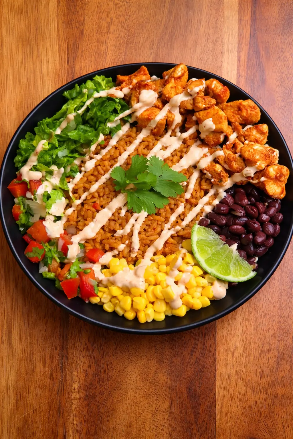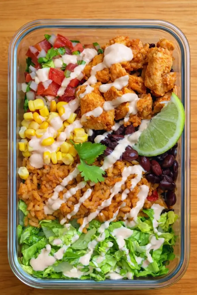 To reheat, warm the rice, beans, and chicken in the microwave, then add the fresh toppings and sauce after. This keeps everything tasting fresh and not soggy.