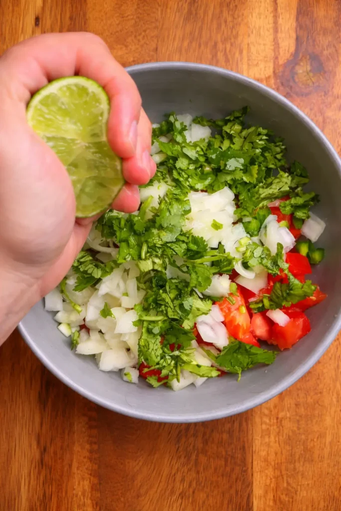Next, make your pico de gallo. Combine diced tomatoes, jalapeño, onion, coriander, lime juice, and seasonings. Give it a good mix and let those fresh flavors come together.