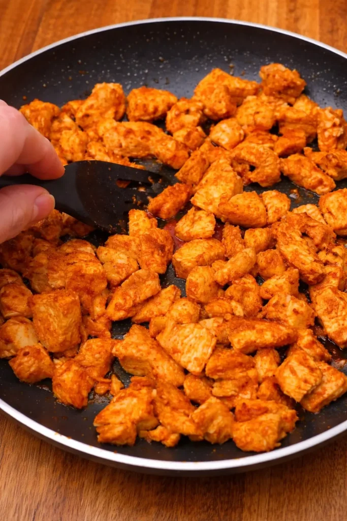 Start by seasoning your diced chicken. Add lime juice, salt, garlic powder, onion powder, cumin, chilli powder, and smoked paprika. Mix everything well so the chicken is fully coated, then let it sit while you prep the rest.