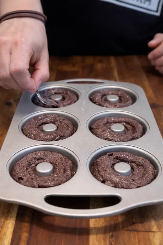 Spoon or pipe the batter evenly into the donut tray, filling each cavity about three-quarters full.
