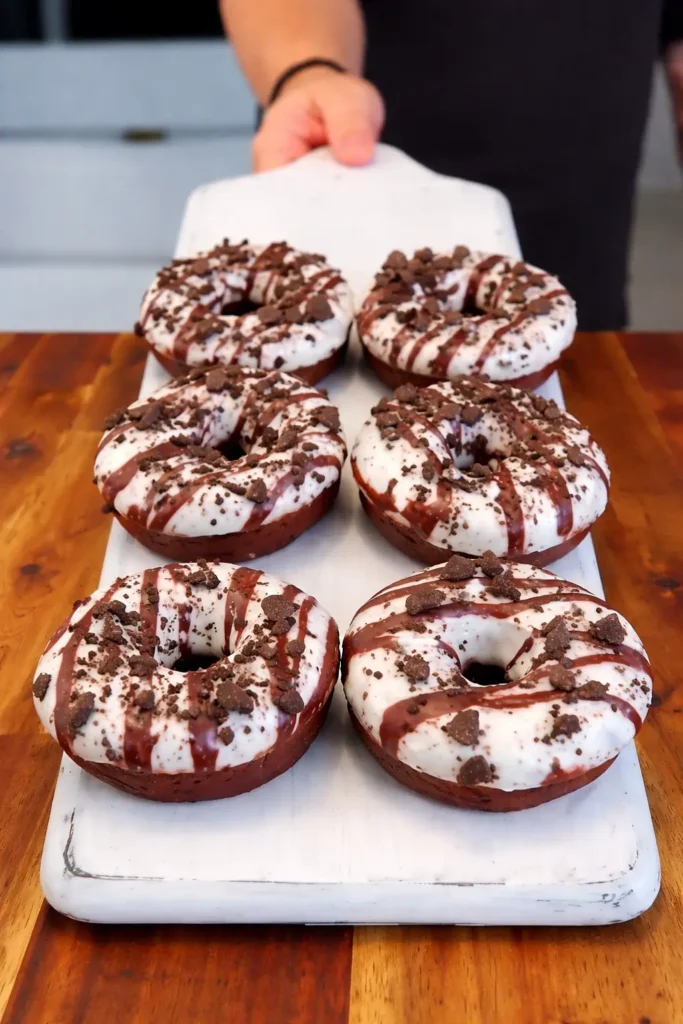 Soft-baked chocolate donuts with a tender crumb, creamy cookies-and-cream frosting, and a finish that feels indulgent while staying shockingly easy.