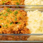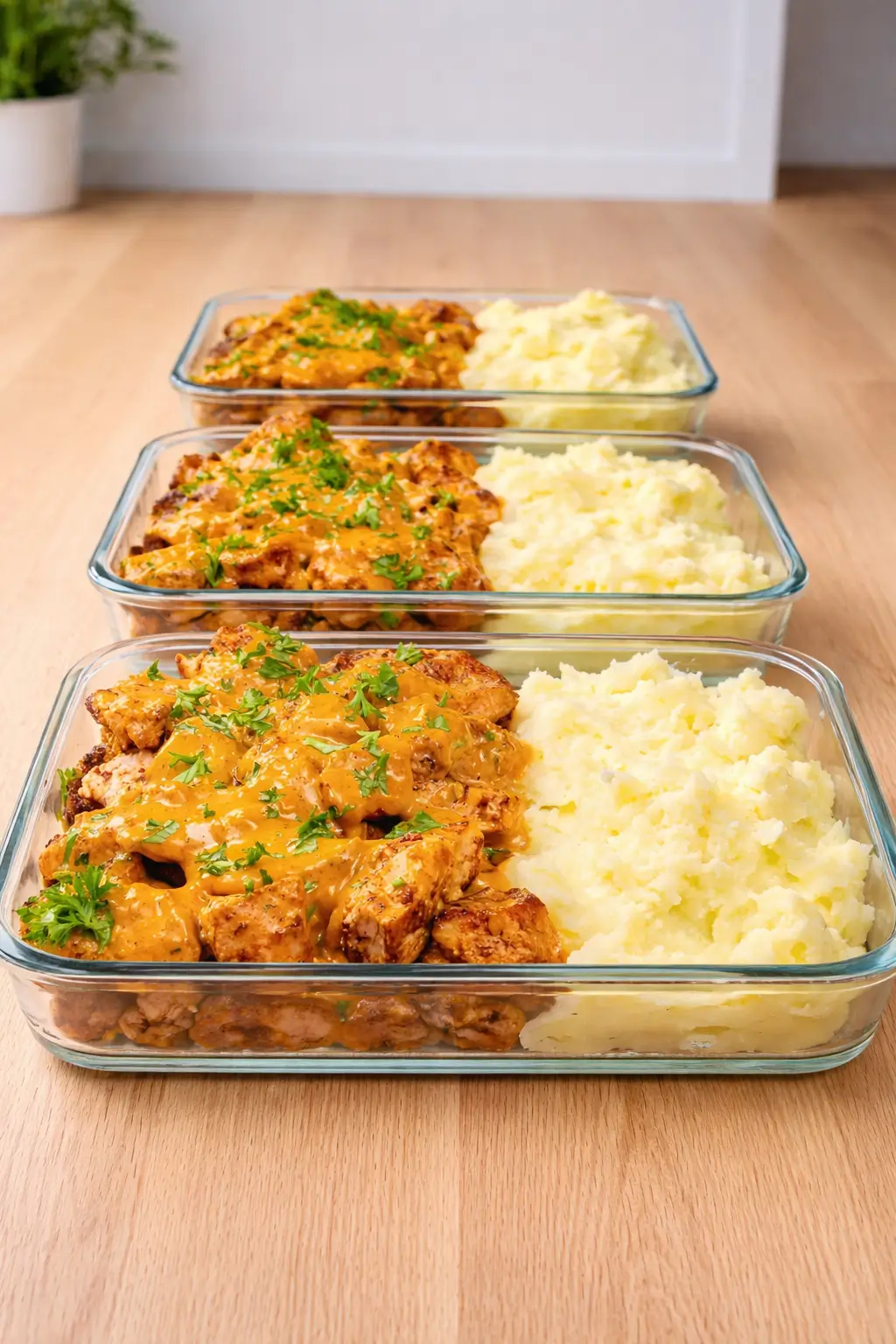 For serving, divide the mashed potatoes and chicken evenly into four meal prep containers. Spoon the creamy garlic sauce over the chicken so every bite is flavorful.