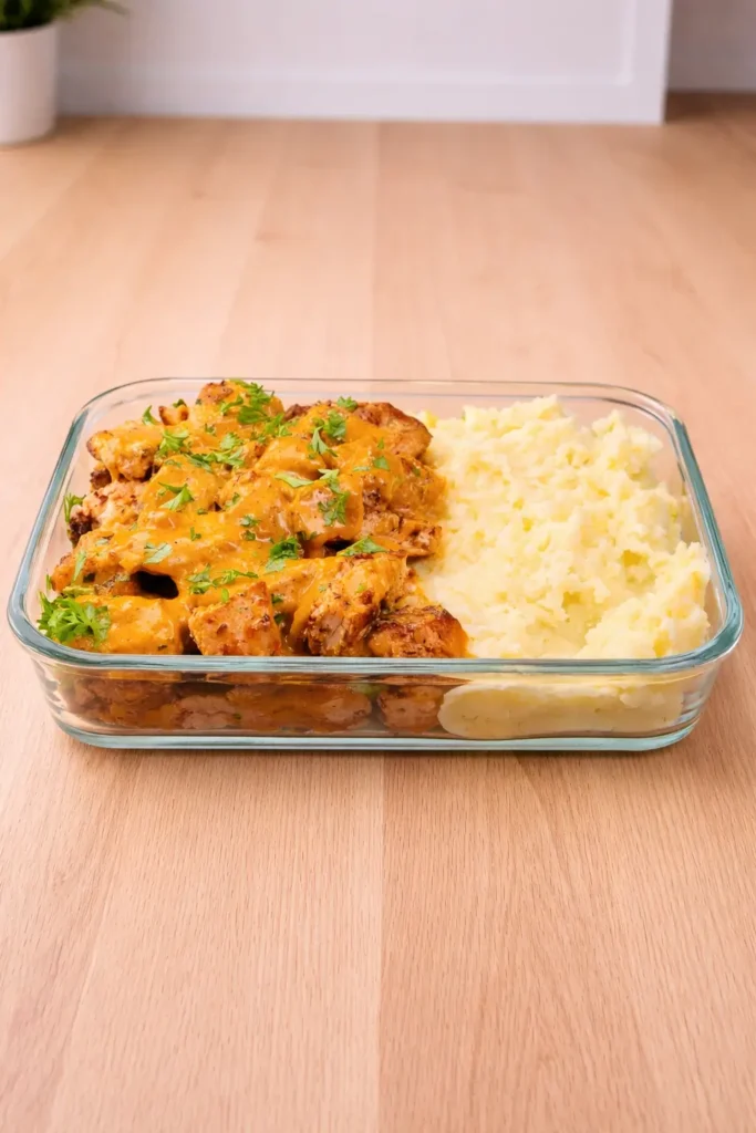 The creamy garlic sauce coats juicy chicken perfectly, while the mashed potatoes are smooth, fluffy, and secretly loaded with extra protein.