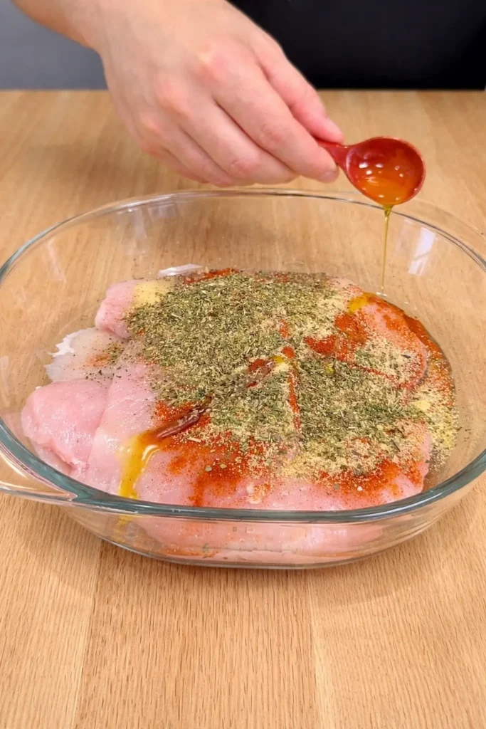 Next, season the thinly sliced chicken breast with salt, smoked paprika, onion powder, and Italian herbs. Add a teaspoon of olive oil and toss everything together so the chicken is well coated.