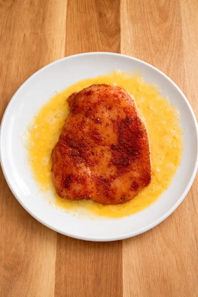 Dip each chicken fillet into the whisked egg, then press it firmly into the cornflake mixture. Make sure it’s well coated. That crunch is everything.