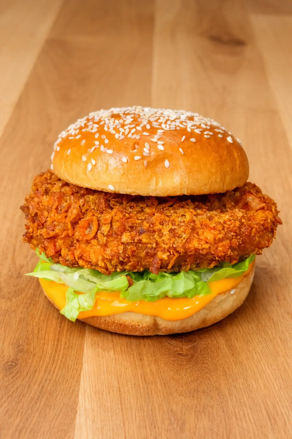 Toast your brioche buns, spread the sauce, add lettuce, then top with your crispy chicken. Close it up and try not to eat it in one bite.