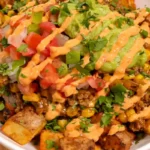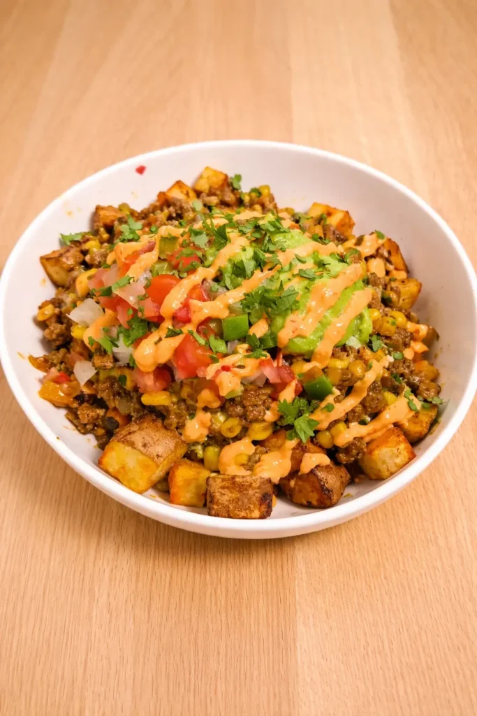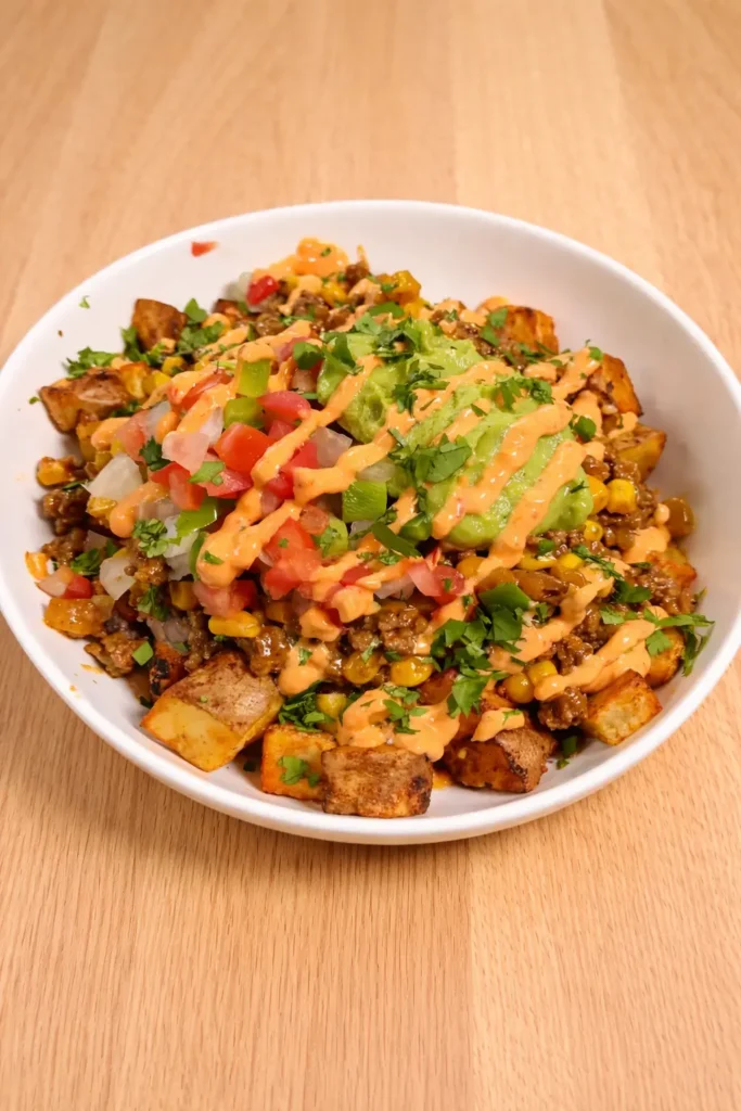 You get crispy potatoes, juicy taco beef, sweet street corn, and that creamy chili-lime sauce that ties everything together.