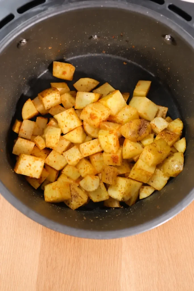 - Cube potatoes and season with garlic powder, paprika, salt, and pepper. Air fry at 400°F until crispy.