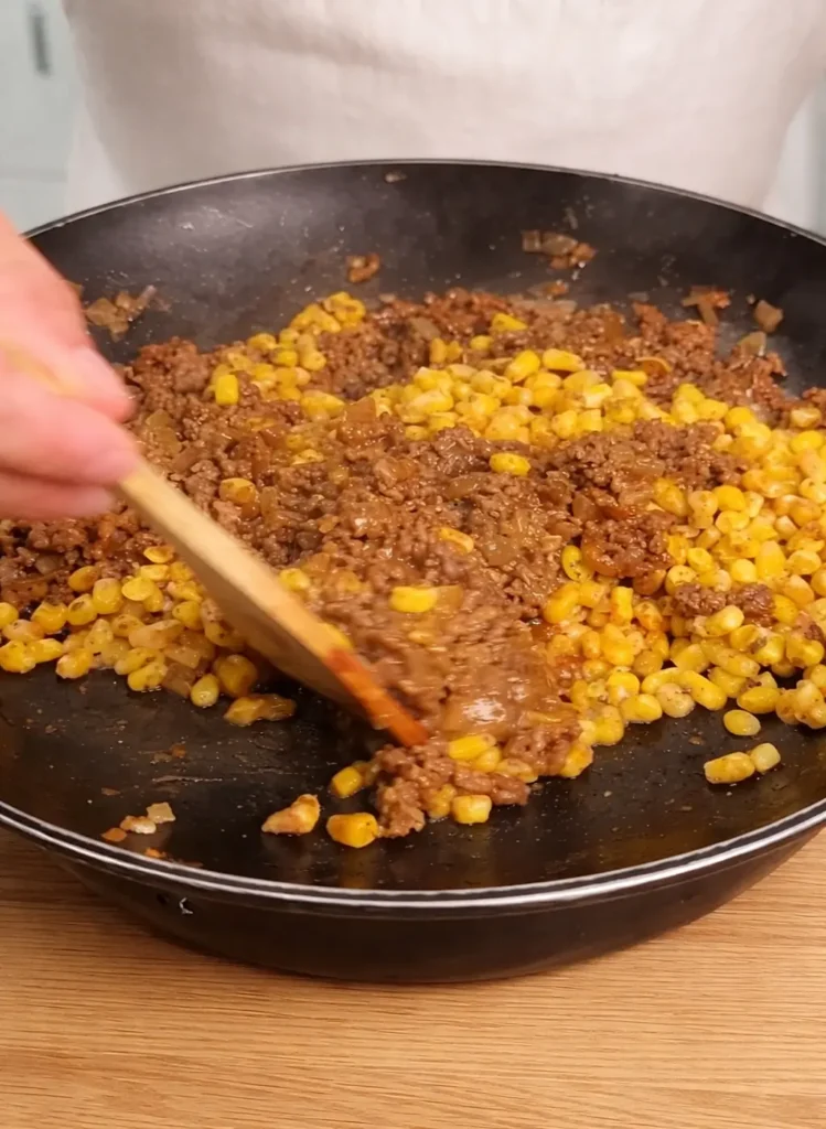 - Sauté onion in a pan until soft. Add ground beef and cook until browned.
