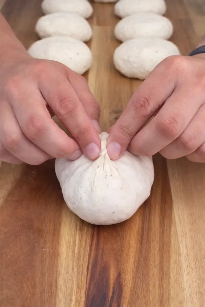 Next comes the fun part. Bring the edges of the dough toward the center and pinch them together to seal the filling inside. Flip the pocket over and gently press it to flatten slightly.