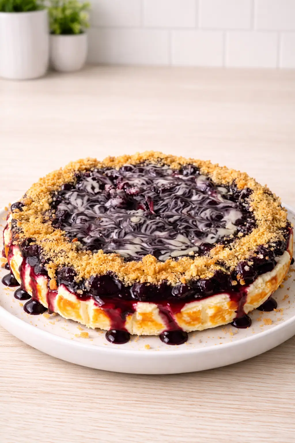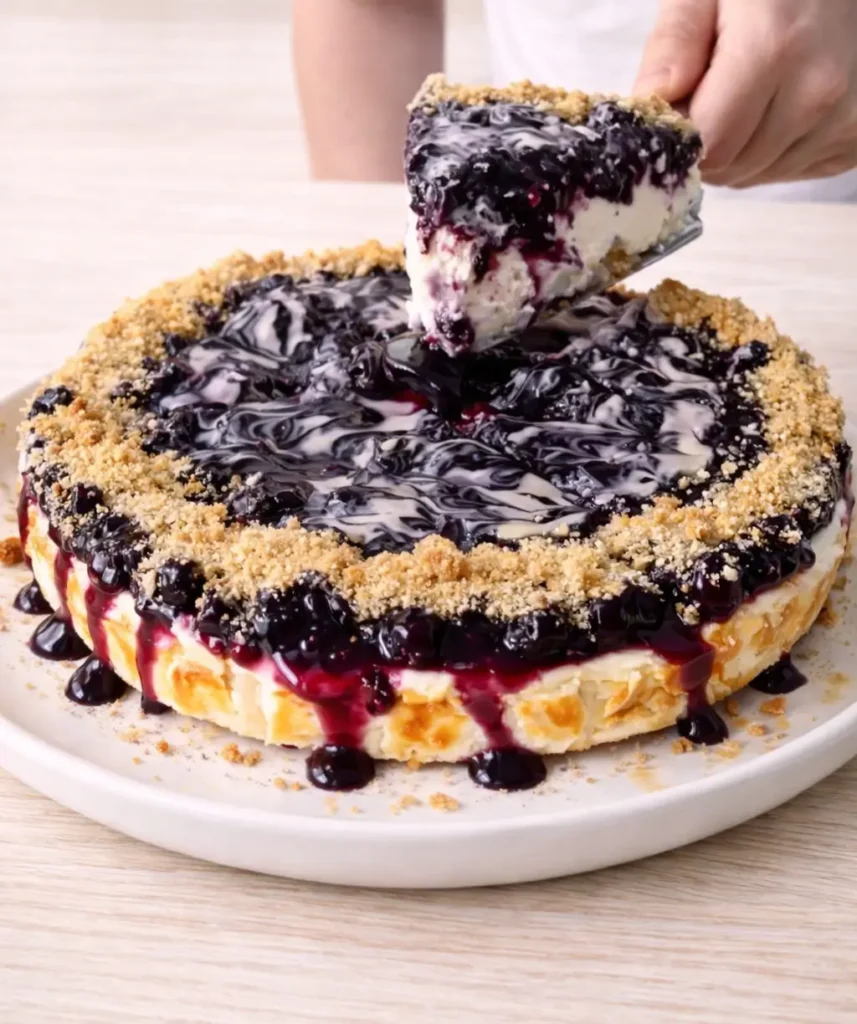 Spread the blueberry topping over the cheesecake. Finish by sprinkling crushed biscuit around the edges and drizzling melted white chocolate on top if you like a little extra sweetness.