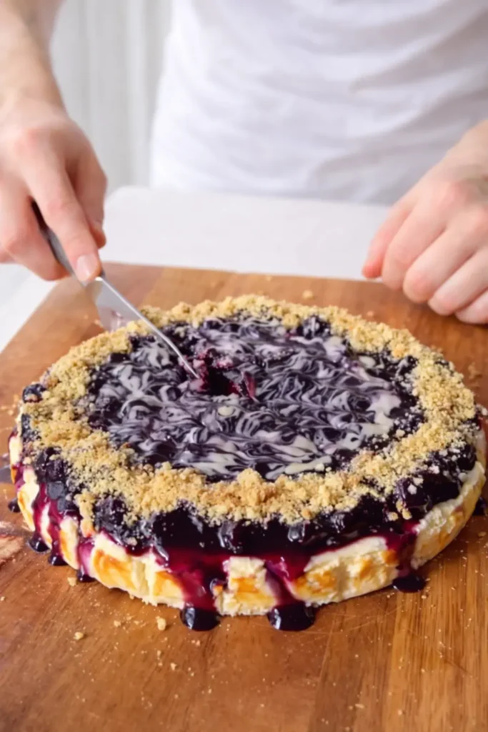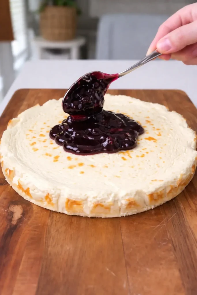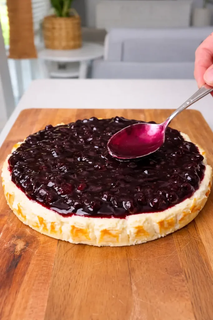 7. Spread the blueberry topping over the cheesecake.