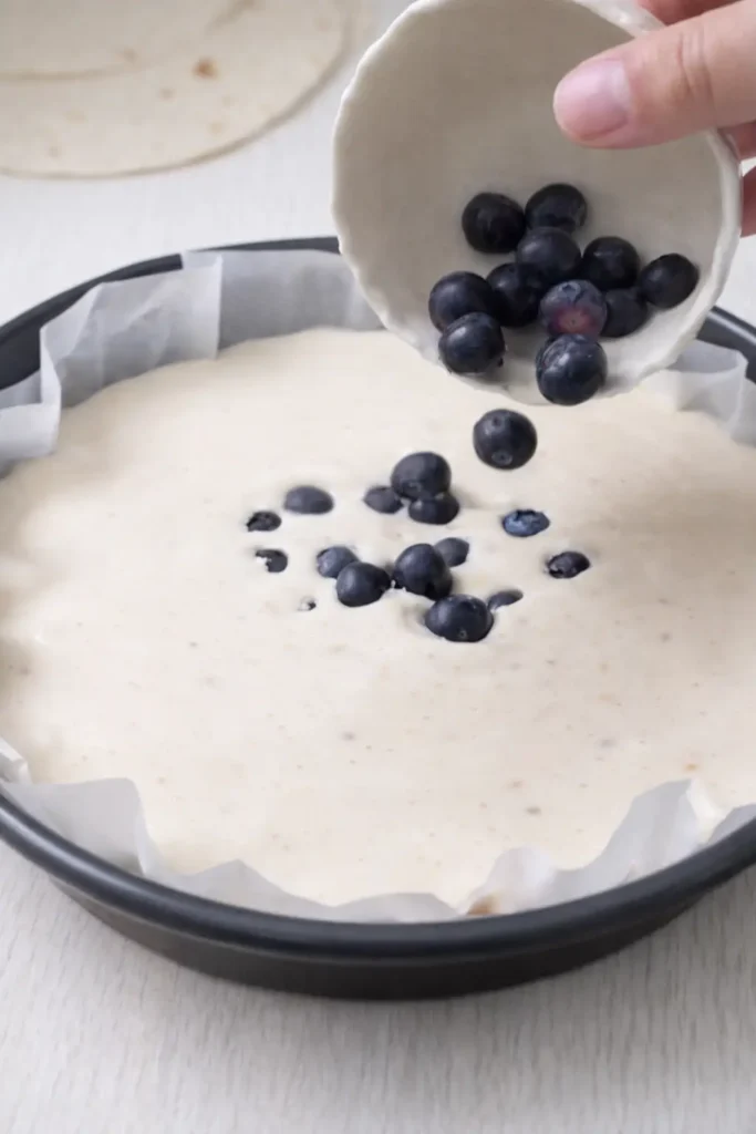 3. Pour the mixture into the lined baking dish. Add some blueberries and gently swirl them through the batter.