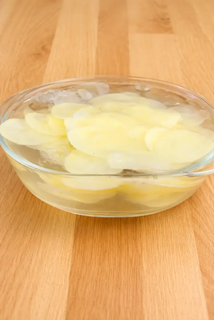 Next, soak the slices in an ice bath. This step helps remove excess starch and gives you that crispier finish.