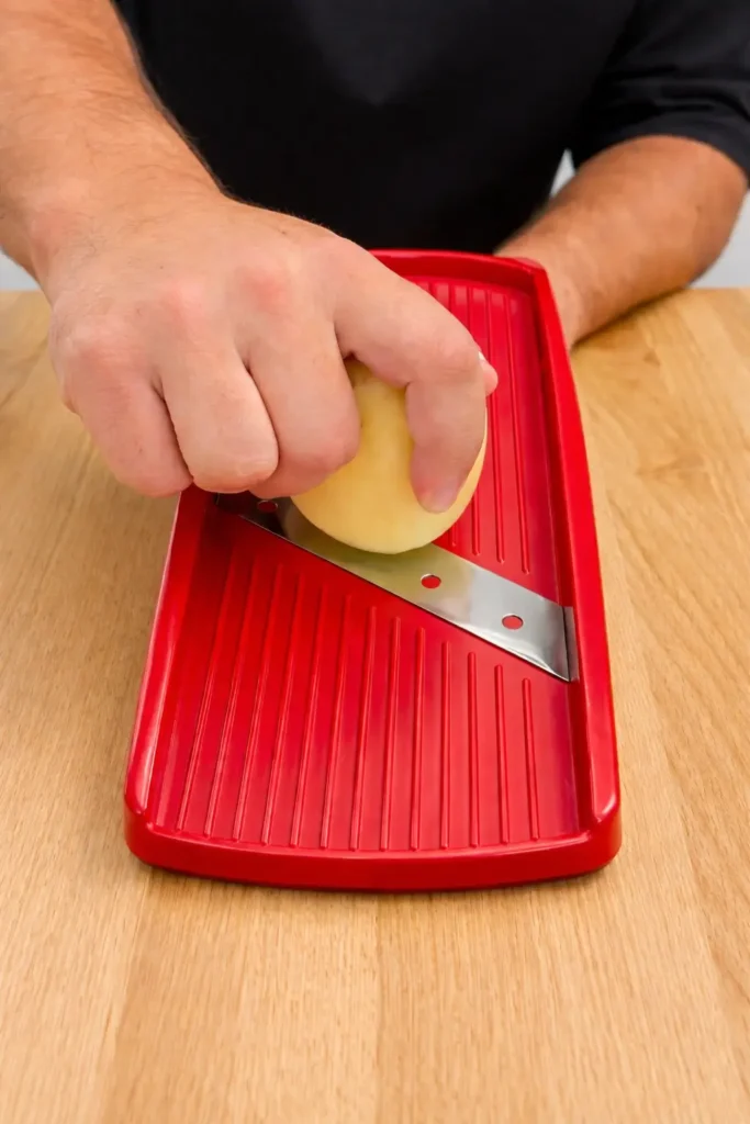 Start by washing and peeling your potatoes. Slice them as thin as possible. A mandolin works best here, but a sharp knife will do if you’re careful.