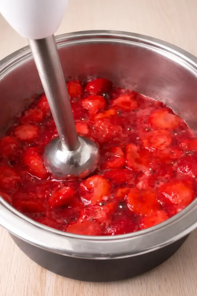 While that chills, you can make the strawberry glaze. Simply heat strawberries with sweetener in a pan, blend until smooth, then thicken with a little cornstarch slurry.