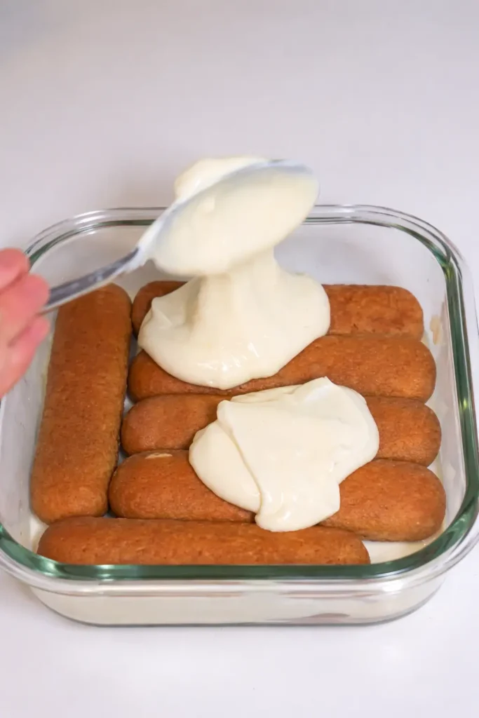 Arrange half of the dipped ladyfingers in an even layer in a glass dish or serving cups.