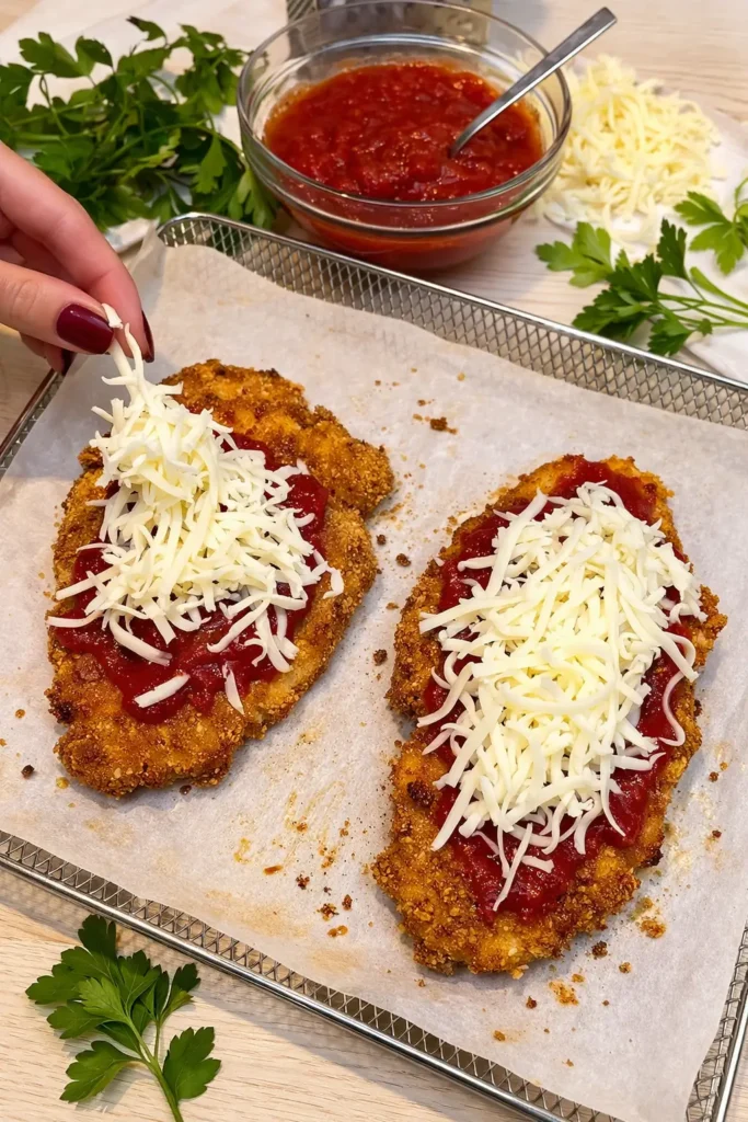 Place the coated chicken on a parchment lined air fryer rack and cook at 425 degrees F for about 12 minutes. While that cooks, stir together the strained tomato passata with salt, garlic powder, basil, oregano, and a touch of olive oil in a small saucepan. Let it simmer for about 5 minutes until slightly thickened.
