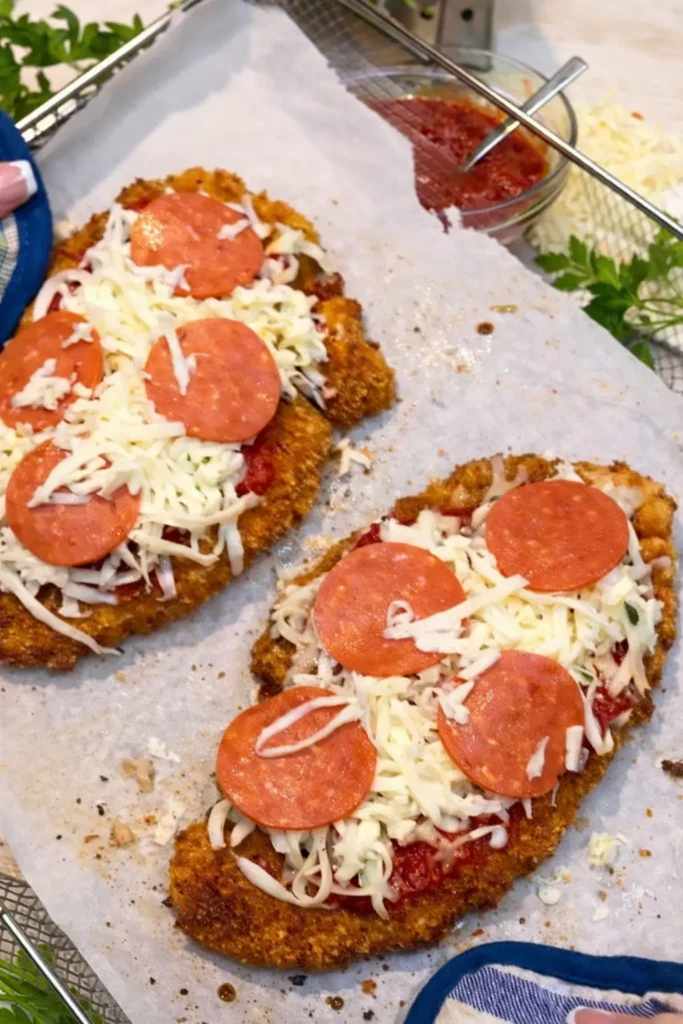 From start to finish, this pepperoni pizza chicken parm takes about 25 minutes. It is perfect for busy weeknights or meal prep Sundays.
