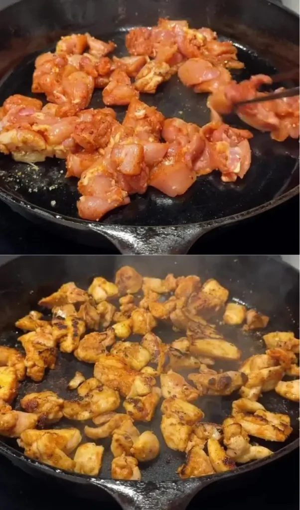 Heat a large skillet over medium-high heat and add one tablespoon olive oil. Once hot, add the chicken in a single layer. Do not overcrowd the pan. Cook for 5–6 minutes, turning occasionally, until deeply golden and cooked through.