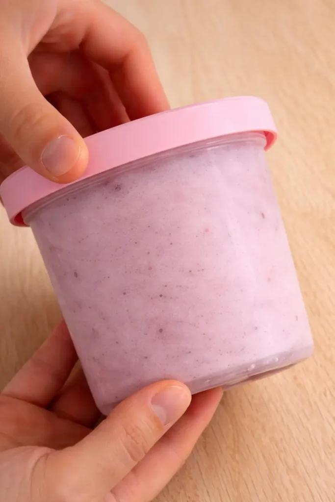 Once blended, pour the mixture into your ice cream pint container. Place it in the freezer and allow it to freeze completely. Overnight works best because it gives the base enough time to fully set.
