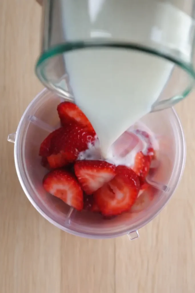 Start by adding the strawberries, fat free milk, protein powder, cheesecake pudding mix, sweetener, and a small pinch of sea salt into a blender. Blend everything until completely smooth. You want the mixture to look like a creamy strawberry milkshake.