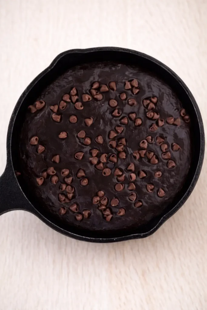 Scoop everything into a small cast iron skillet, smooth it out, and sprinkle extra chocolate chips on top.